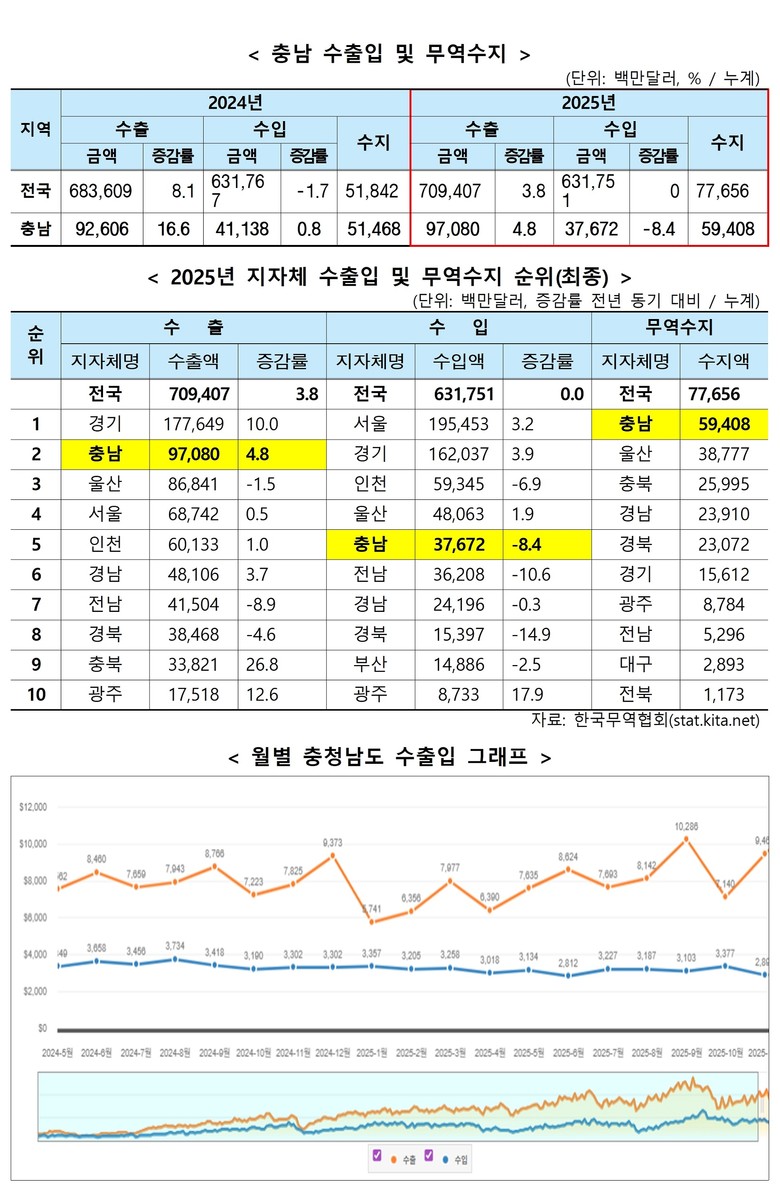 도는 22일 ‘2025년 충청남도 수출입 동향 보고’ 발표를 통해 수출액 971억 달러, 수입액 377억 달러를 기록해 무역수지 594억 달러 흑자를 달성했다고 밝혔다.