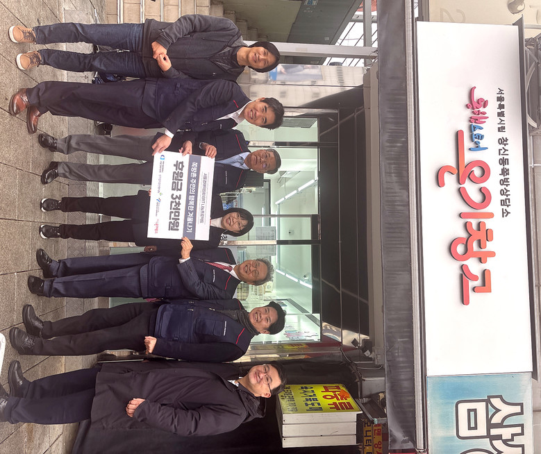 | ▲ 온기창고 앞 기부전달식(왼쪽부터 남병철 쪽방상담소 실장, 김광석 부위원장·손태순 부위원장·권오성 위원장·손영진 부위원장·조영준 지속가능경영원장) |
