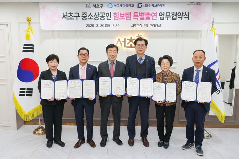| ▲ 30일 서초구청에서 열린 '서초구 중소상공인 초스피드 대출' 지원을 위한 서초구, 새마을금고, 서울신용보증재단 간 특별출연 협약식에서 (왼쪽부터) 김명 서초새마을금고 이사장, 한규석 서초중앙새마을금고 이사장, 전성수 서초구청장, 배준성 새마을금고 서울지역 본부장, 윤성희 서초제일 새마을금고 이사장, 최승일 서울신용보증재단 강남지역 본부장이 기념사진을 촬영하고 있다. |