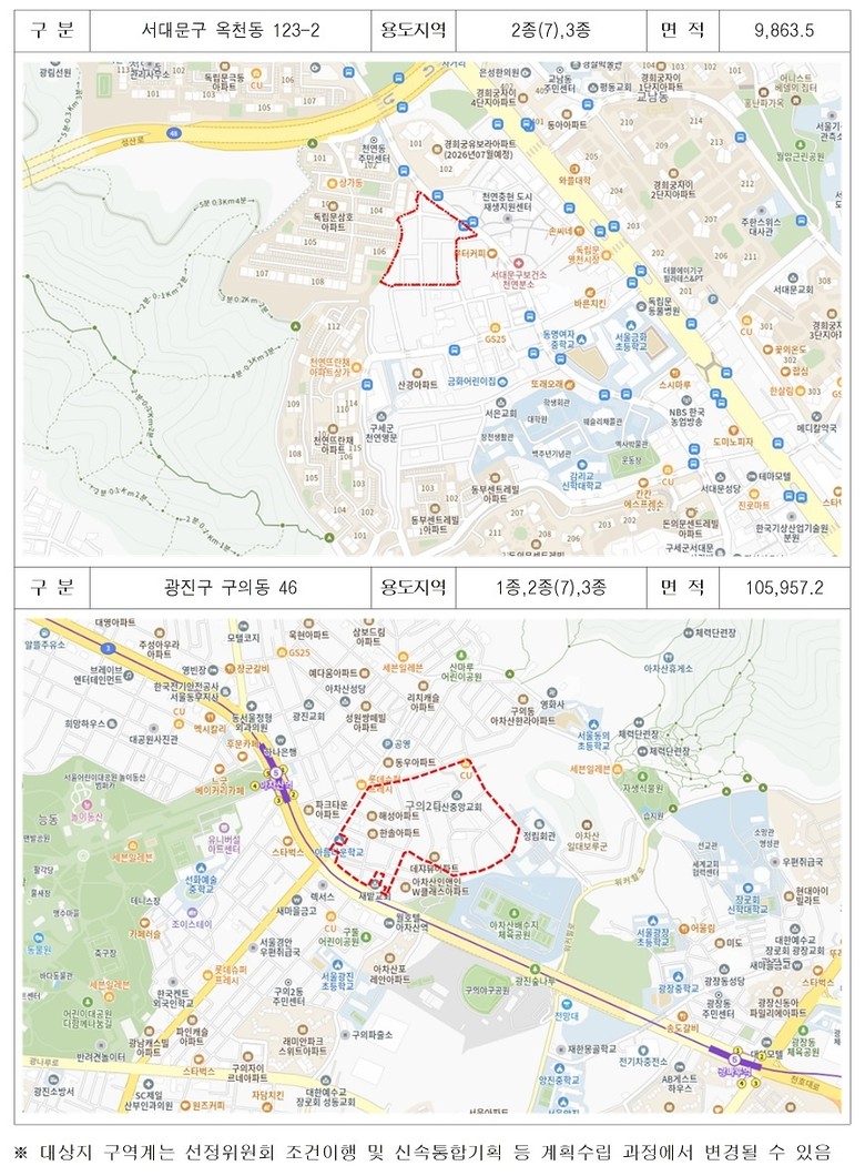 먼저, 개봉동 66-15, 불광동 442/445번지 일대는 노후도가 70%에 달하고 반지하주택 비율이 50% 이상인 저층 주거지로 주거환경 개선이 시급한 지역이다. 옥천동 123-2번지와 구의동 46번지 일대는 주민 70% 이상이 사업추진에 동의하는 등 주민 참여 의지가 높은 지역이며, G밸리와 인접한 구로동 792-33번지 일대는 주변 개발사업과 연계한 생활·여가 공간 조성이 기대되는 곳이다.