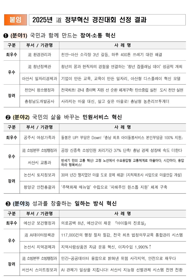 최우수상은 △참여·소통 혁신 분야 ‘천안-아산 소각장 3년 갈등, 하루 400톤 쓰레기 대란 해결(도 환경관리과)’ △민원서비스 혁신 분야 ‘돌봄은 업(UP)! 부담은 다운(Down)! 충남 최초 아이돌봄서비스 본인부담금 100% 지원(공주시 여성가족과)’ △일하는 방식 혁신 분야 ‘의료공백 8년, 예산군이 채운 아이들의 진료실(예산군 보건행정과)’이 수상했다.