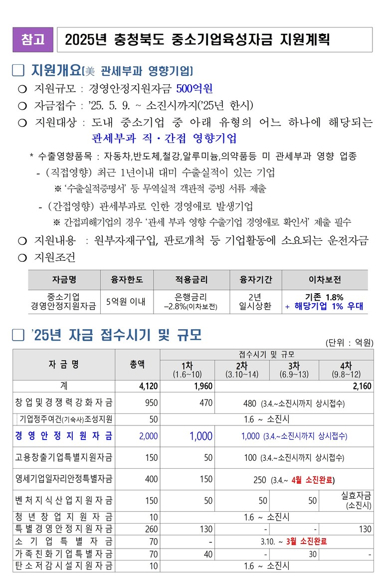 특히, 대미 수출 실적이 있는 직접 영향 기업 뿐만 아니라, 관세부과로 인해 경영애로가 발생한 간접 영향 기업까지 지원대상에 포함하여, 대미 수출 기업부터 산업 공급망 하단에 위치한 영세 납품사에 이르기까지, 미 관세 조치에 대한 도내 기업 타격 최소화를 위해 전방위적 지원에 나선다는 방침이다. 5월 9일부터 충청북도기업진흥원에서 자금 신청·접수를 받고 있으며, 자금 소진 시까지 지원한다.