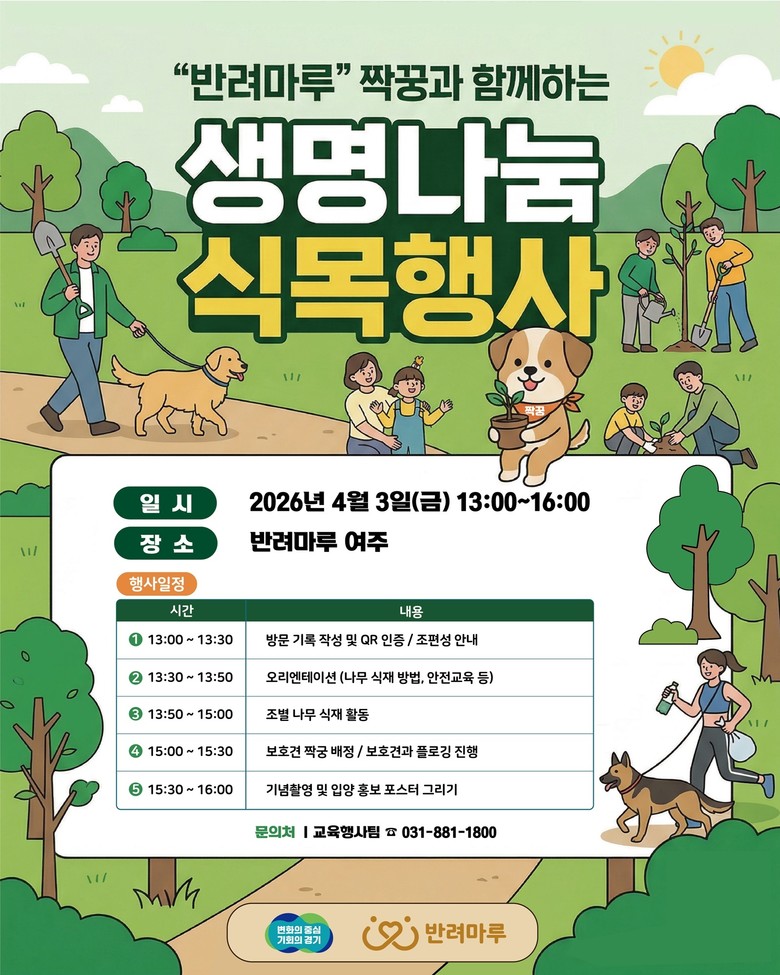 이에 따라 경기도는 3월 30일부터 4월 5일까지를 올해 첫 반려동물 입양주간으로 지정하고 4월 3일 반려마루 여주에서 펫리더스 봉사단과 반려마루 짝꿍, 식목 행사를 진행한다.