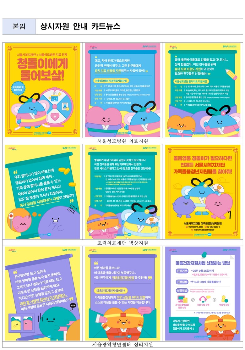 재단은 가족을 돌보느라 정작 자신의 생활을 챙기지 못하는 청(소)년의 마음도 돌본다. 서울청년광역센터와 연계해 가족돌봄청(소)년(만 19세~39세)에게 ‘서울시 마음건강 지원사업’을 패스트트랙으로 상시 지원한다.
