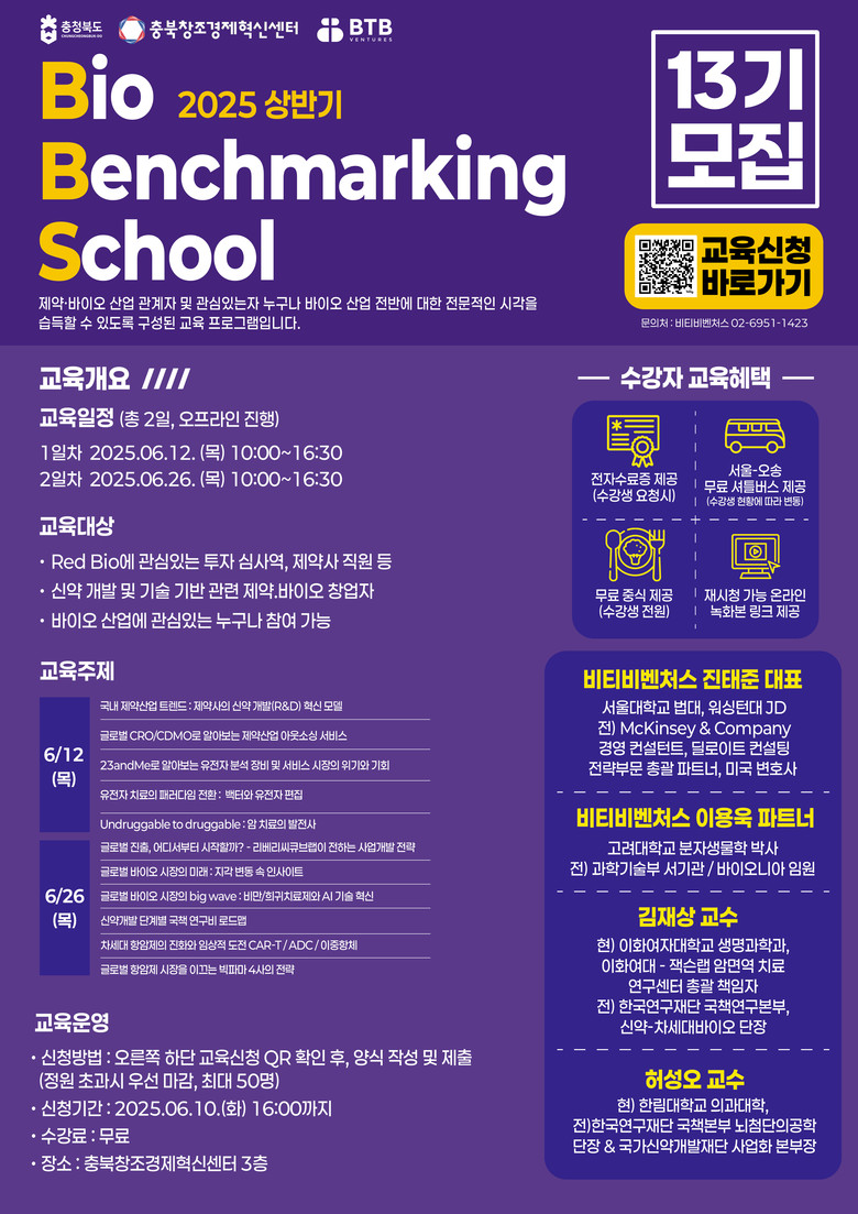 이번 9기 과정은 AI Software 기반 디지털의료제품과 조직수복용생체재료인 필러를 테마로, 시장현황 분석부터 인허가 제도, GMP사례, 기술문서 개요, 보험등재 전략, 글로벌 진출 전략까지 의료기기 사업화에 필수적인 전주기 실무 지식을 제공할 예정이다. 참여신청은 충북창조경제혁신센터 홈페이지를 통해 6월 17일(화)까지 할 수 있다.