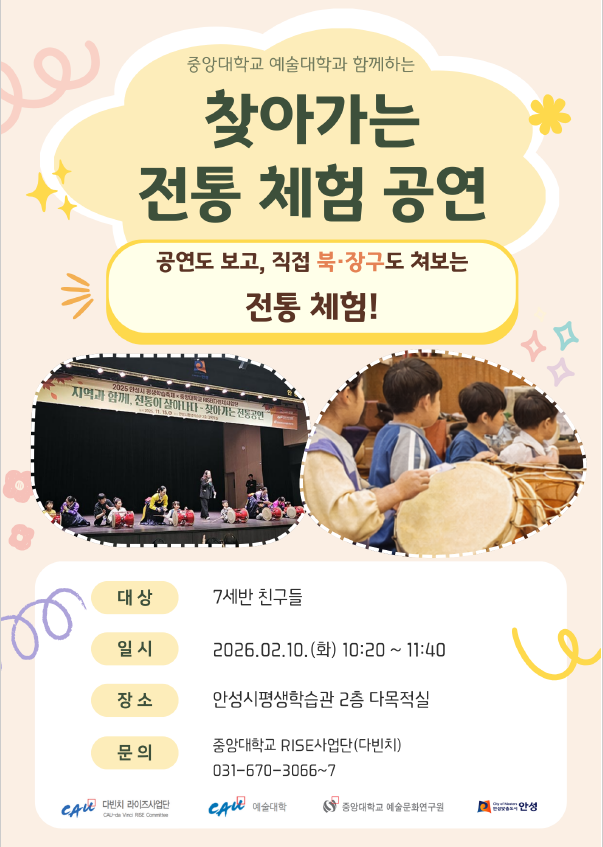 이번 공연은 중앙대학교 RISE사업단과 연계한 생활 속 평생학습관 운영 활성화 사업의 일환으로, 어린이와 시민이 전통문화를 보다 쉽고 친근하게 접할 수 있도록 기획됐다.