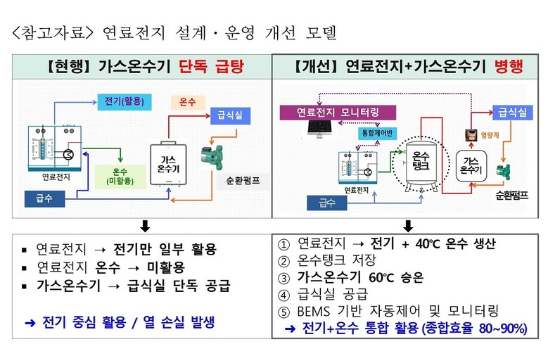 연료전지에서 발생하는 40℃ 온수를 먼저 온수탱크에 저장한 뒤 가스온수기에서 60℃로 재가열해 활용하는 ‘병행운전 모델’을 적용하면 연간 가스요금을 약 22~43%(약 300만~350만 원) 수준으로 절감하는 효과가 예상된다.