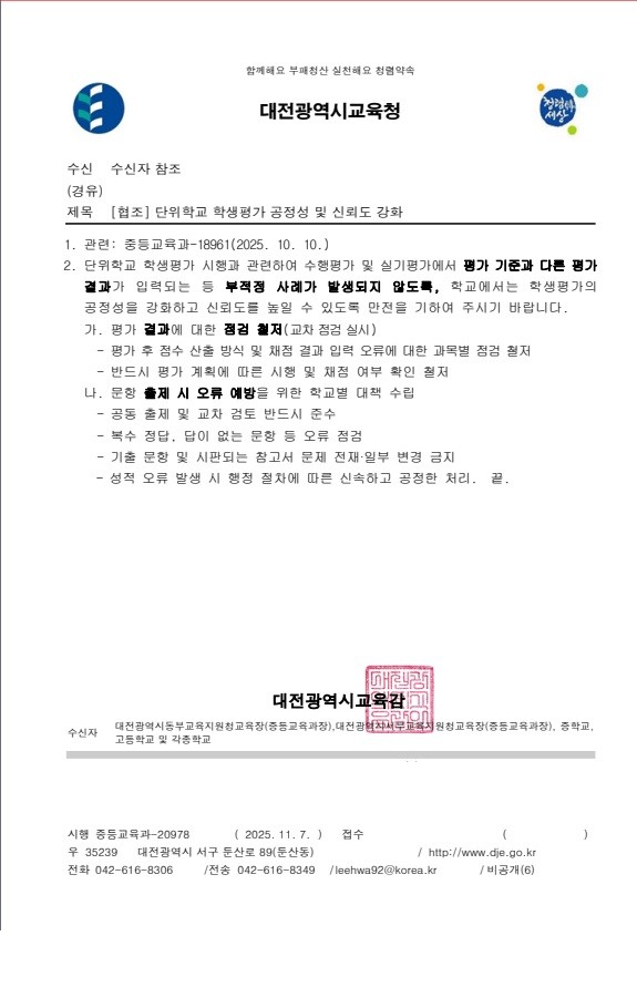 시교육청 조진형 중등교육과장은“평가를 객관적이고 공정하게 실시하고, 과도한 학습 부담과 평가 격차가 생기지 않도록 유의해야 한다”면서“시교육청도 단위학교 성적 관리의 공정성과 신뢰도 제고를 위해 최선을 다하겠다”고 말했다.