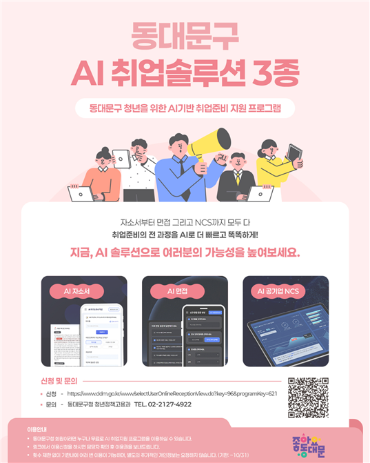 - AI 면접 체험, AI 자기소개서 분석, NCS 학습지원으로 구성 [동대문구 세계타임즈=이장성 기자] 서울 동대문구(구청장 이필형)가 지역 청년들의 구직 경쟁력 향상을 위해 관내 19~39세 청년을 대상으로 ‘AI 취업 솔루션 3종’을 운영한다.