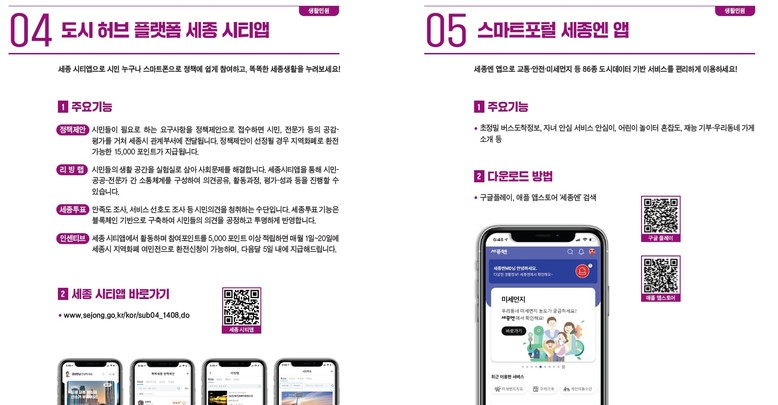 특히, 관내 체육시설 등을 이용하기 위한 통합예약시스템 활용 방법, 세종형 대중교통 월 정액권 ‘이응패스’ 가입 방법, 세종시 지역화폐 ‘여민전’ 이용 방법 등 세종살이에 꼭 필요한 핵심 정보를 담았다.