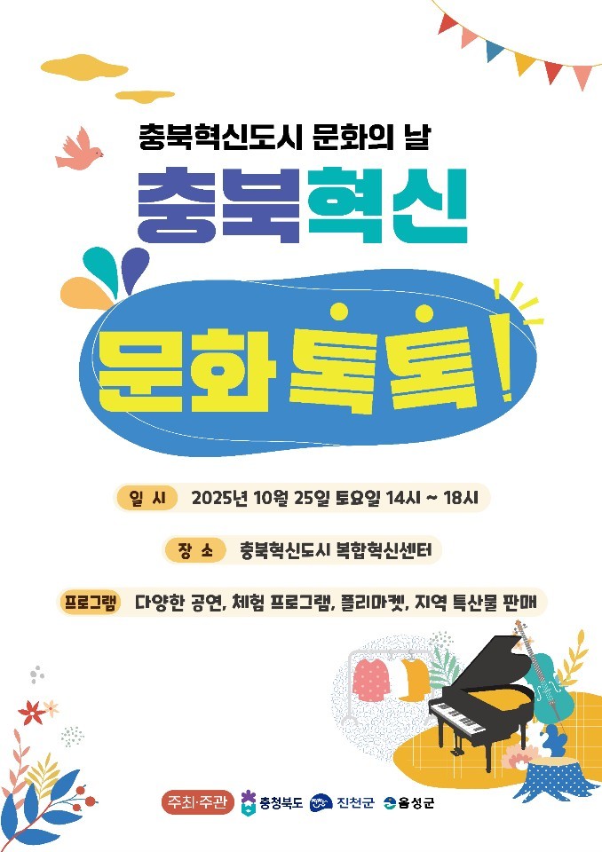 이날 개최되는 문화의 날 행사는 ‘충북혁신 문화톡톡’이라는 행사명으로 오후 2시부터 오후 6시까지 진행되며, 지역민들이 함께 참여하여 즐길 수 있는 어린이 뮤지컬, 국악 공연, 클래식 앙상블 등 전 세대가 어울릴 수 있는 프로그램으로 구성되어 있다.