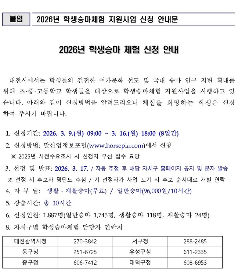 참가를 원하는 학부모는 9일 9시부터 16일 18시까지 말산업정보포털 호스피아(www.horsepia.com)에 회원가입 후 신청하면 된다. 참가자는 17일 호스피아 시스템을 통한 자동 추첨으로 선정되며, 결과는 당일 오후 2시 이후 해당 자치구 홈페이지(구정소식-공지사항)를 통해 발표된다.