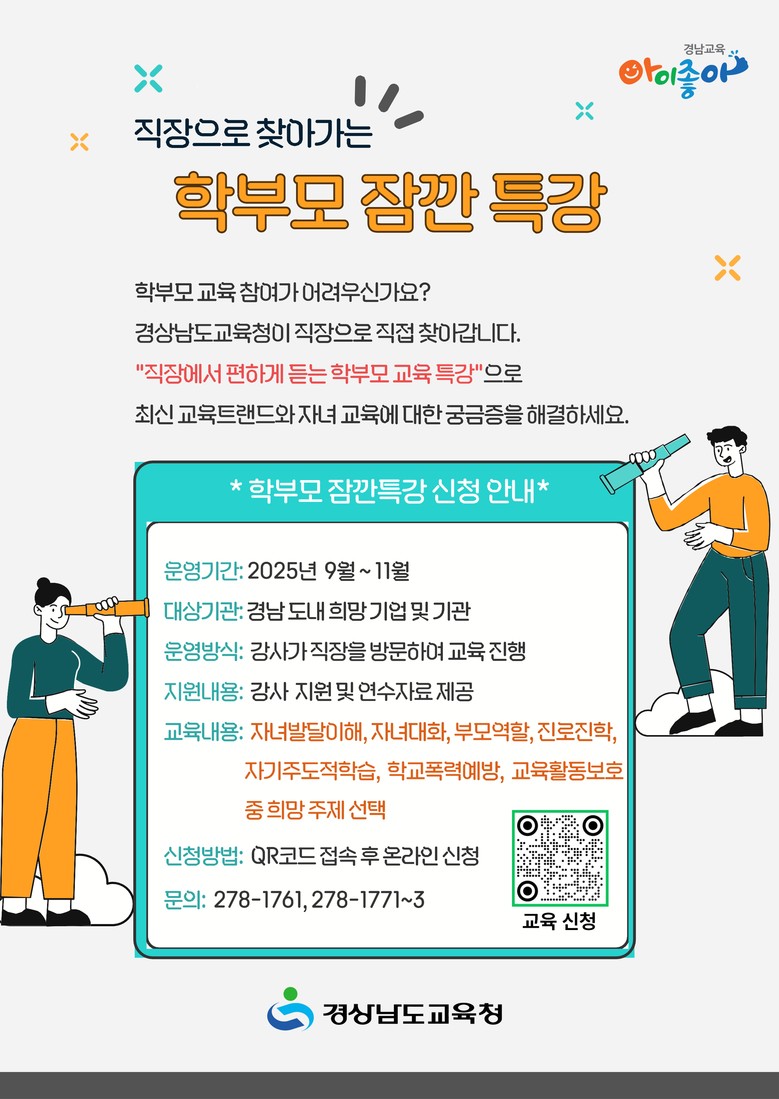 이번 사업은 가족 친화적인 직장 문화를 만들고 학부모 교육 참여 기회를 넓히기 위해 마련됐으며 도내 기업.기관 10곳을 대상으로 진행된다.
