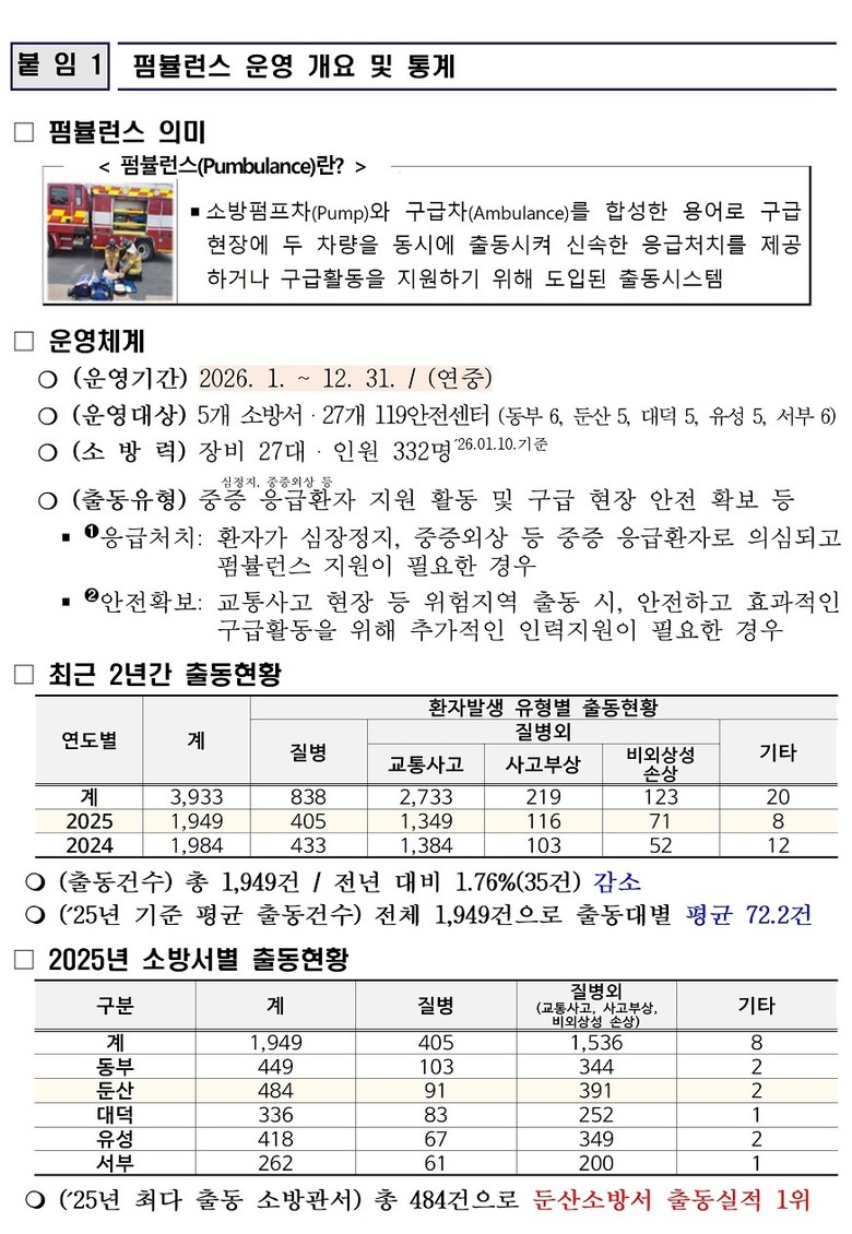 - 지난해 1,949건 출동…골든타임 확보 다중출동체계 정착 - [대전 세계타임즈=이채봉 기자] 대전소방본부(본부장 김문용)는 2026년 펌뷸런스 출동체계를 연중 상시 가동하고 있다고 밝혔다.