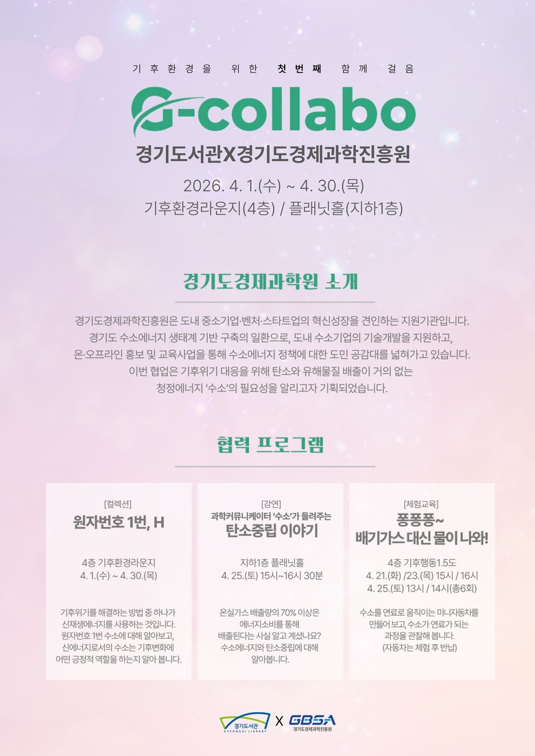 이번 협업은 경기도서관 기후환경 콘텐츠 사업 ‘지-콜라보(G-COLLABO)’의 첫 사례로, 머리말 알파벳 ‘G’는 경기(Gyeonggi), 글로벌(Global), 그린(Green), 지구(Ground)를 상징하며 ‘콜라보(COLLABO)’는 기관 간의 긴밀한 연결을 뜻한다. 경기도서관은 올해 총 20개 협업프로젝트를 추진해 기후환경 특화 도서관 기능을 강화할 계획이다.