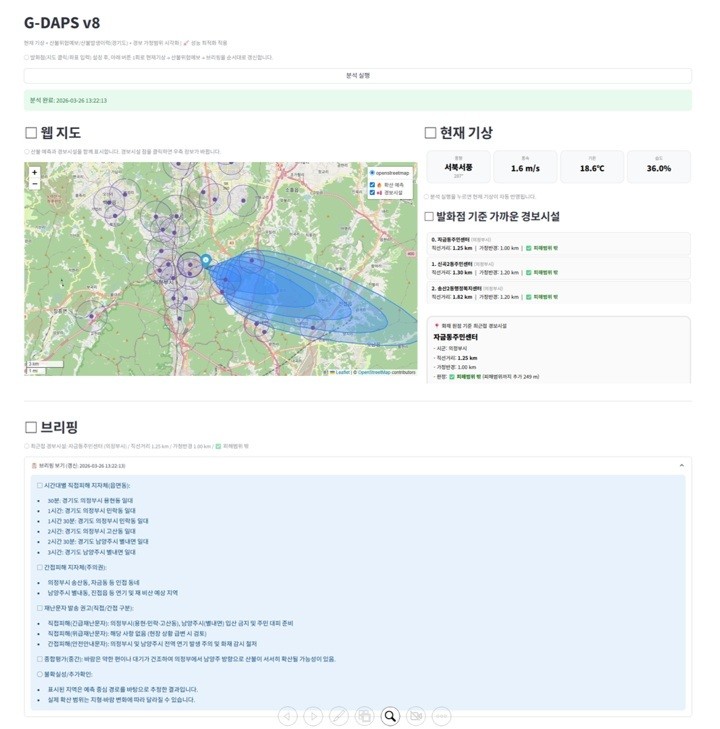 기상 상황과 산불위험예보 및 발생 이력, 민방위 경보시설 가청 범위를 웹 지도에 시각화하여 보여준다. 이를 바탕으로 산불 위험을 30분 단위로 분석해 직접 피해를 입는 읍면동 단위까지 피해 지자체를 파악한다. 근무자는 이 정보를 활용해 특정지역에 대한 경보 발령, 재난문자 발송 등을 할 수 있다.