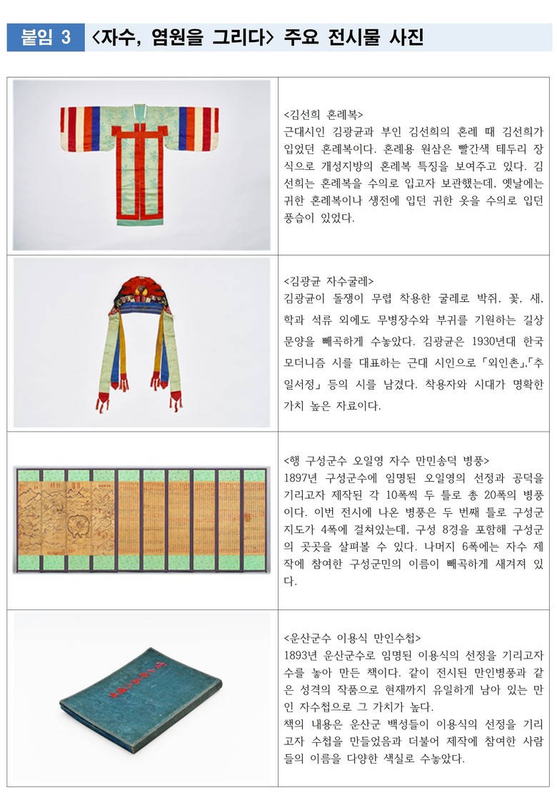 - <김광균 자수굴레>, <행 구성군수 오일영 자수 만민송덕 병풍> 등 신규 지정문화유산 다수 공개