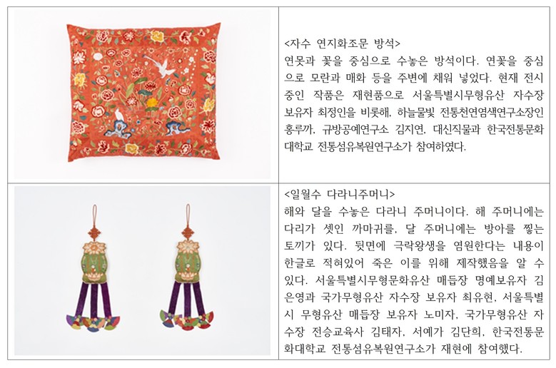 재현 작품에는 보물 <자수가사>, 국가민속문화유산 <일월수 다라니주머니>, 서울시 유형문화유산 <자수 연화당초문 현우경 표지>, <자수 연지화조문 방석> 등 4건이 있다.