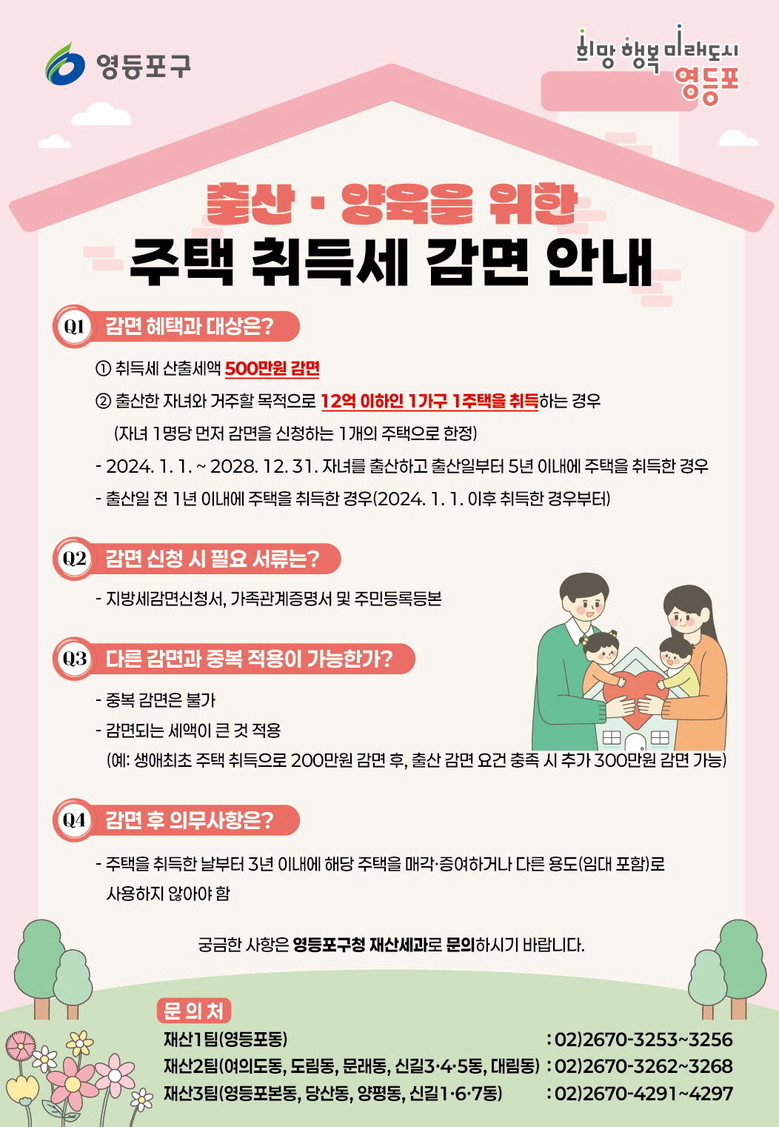 최호권 영등포구청장은 “이번 주택 취득세 감면 혜택이 출산 가구의 경제적 부담을 덜어주는 데 도움이 되기 기대한다”라며 “다양한 돌봄 지원 정책을 지속적으로 확대해 아이 키우기 좋은 영등포구 만들어 가겠다”라고 전했다.