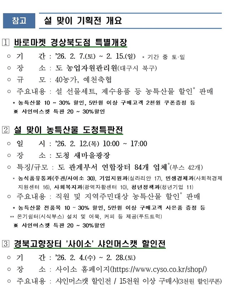 한편, 경북도는 명절을 앞두고 가계 부담 완화를 위해 오프라인 직거래 장터를 집중 운영한다. ‘바로마켓 경상북도점(대구 북구)’은 오는 15일까지 주말 특별개장을 통해 제수용품을 10~30% 할인 판매한다. 또한 5만 원 이상 구매 시 2천 원 할인쿠폰을 제공한다.
