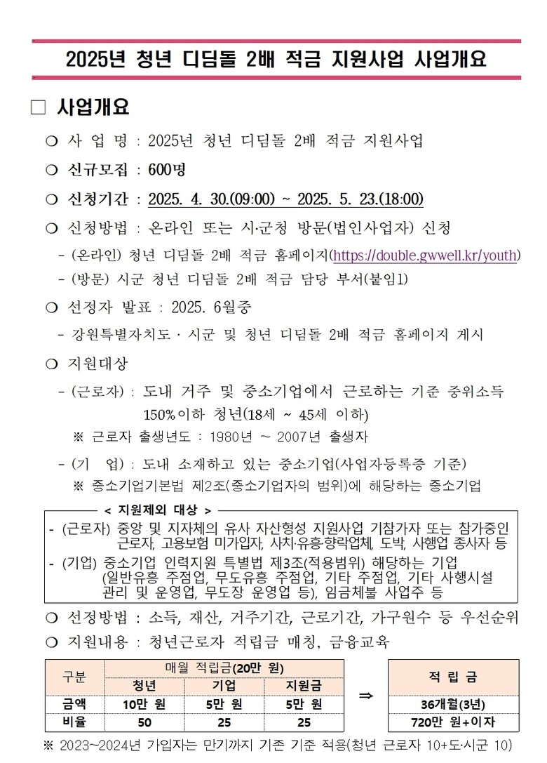 기업과 근로자의 신청 준비기간을 고려하여 사전공고(4월 21일)하고, 신청은 4월 30일(수) 오전 9시부터 5월 23일(금) 오후 6시까지 청년 디딤돌 2배 적금 홈페이지(https://double.gwwell.kr/youth)에서 가능하다.