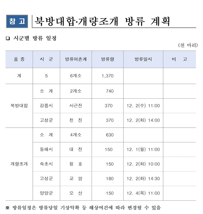 [강원도 세계타임즈=김민석 기자] 강원특별자치도(도지사 김진태)는 12월 1일부터 4일까지 도내 5개 시군(강릉·동해·속초·고성·양양) 6개 어촌마을 해역에 북방대합 74만 마리와 개량조개 63만 마리 등 총 137만 마리를 무상 방류한다고 밝혔다.