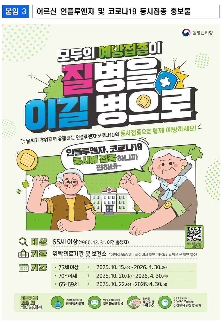 도는 현재 생후 6개월~13세 어린이, 임신부, 65세 이상 어르신*을 대상으로 2025~2026절기 인플루엔자 국가예방접종을 지원하고 있으며, 지역 접종률**은 목표치(어르신 81.5% 등)보다 낮은 접종률을 보이고 있어 도민의 안전하고 건강한 겨울나기를 위해 적극적인 예방접종 참여가 필요한 실정이다.