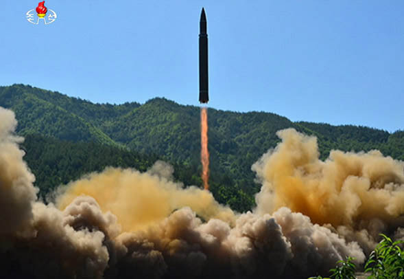 합동참모본부는 29일 "북한이 어제 오후 11시 41분경 자강도 무평리 일대에서 동해상으로 불상 미사일 1발을 발사했다"고 밝혔다. 미국 국방부는 북한이 발사한 비행체가 대륙간탄도미사일(ICBM)이라고 확인했다. 사진은 북한이 지난 4일 진행된 대륙간탄도미사일 '화성-14' 시험발사 장면. 2017.07.29. (사진=뉴시스 DB)