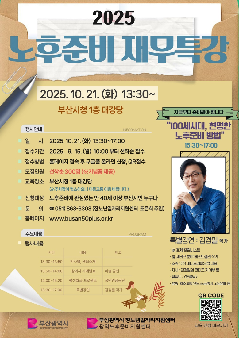 노후 준비에 관심 있는 만 40세 이상 부산 시민이라면 누구나 특강을 들을 수 있으며, 참석자들은 현장에서 전문적인 노후 준비 진단과 상담 서비스도 신청할 수 있다.