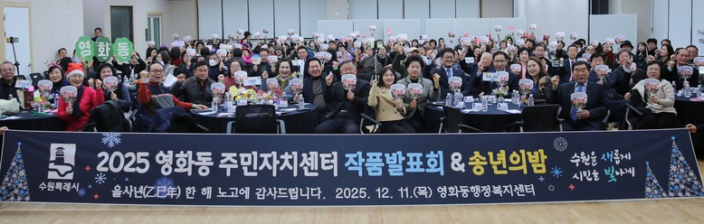 [수원시 세계타임즈=송민수 기자] 수원시 장안구 영화동은 지난 11일, 동 행정복지센터 3층 대강당에서 한 해 동안 갈고닦은 실력을 뽐내고 올 한 해를 돌아보는 ‘2025 영화동 주민자치센터 작품발표회 & 송년의 밤’을 개최했다.