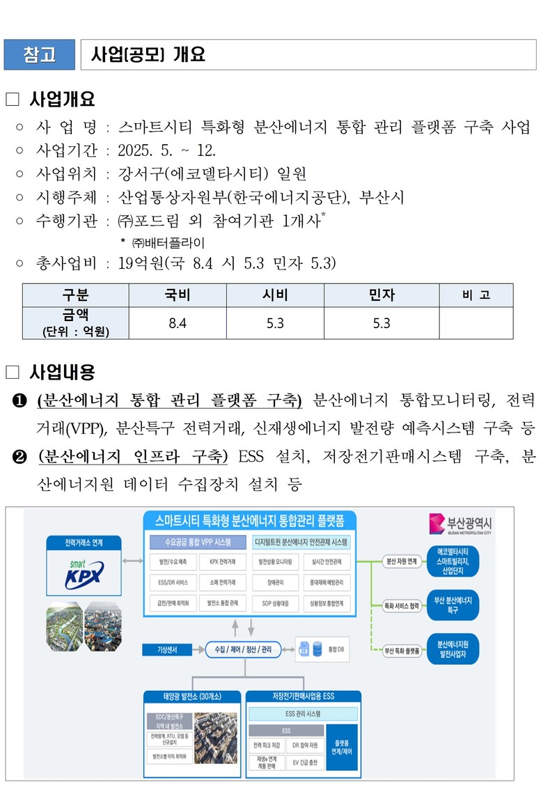 ◈ ▲강서구 에코델타시티와 주변 산업단지 내 분산에너지 통합모니터링, 전력거래 시스템, 분산특구 직접 전력거래 등 통합관리 플랫폼 구축 ▲에너지저장장치(ESS) 활용 저장전기 판매, 분산에너지 기반시설(인프라) 구축 등 추진 [부산 세계타임즈=이용우 기자] 부산시(시장 박형준)는 산업통상자원부(한국에너지공단)의 「2025년 미래 지역에너지 생태계 활성화 지원사업」 공모에 시가 에너지 기업인 ㈜포드림, ㈜배터플라이와 연합체(컨소시엄)를 구성해 응모한 '스마트시티 특화형 분산에너지 통합 관리 플랫폼 구축 사업'이 최종 선정됐다고 밝혔다.