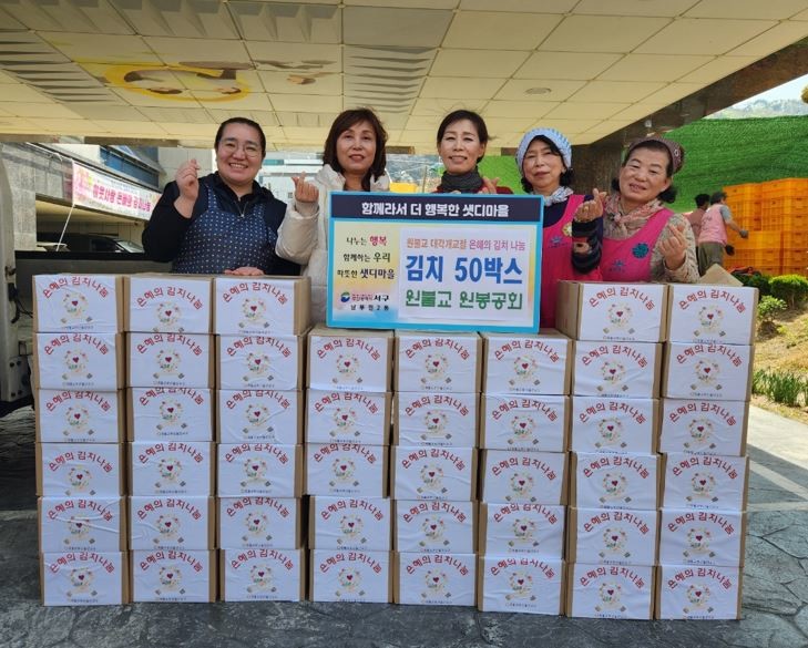 [서구 세계타임즈=이용우 기자] 원불교 원봉공회(회장 고화중)에서 대각개교절을 맞아, 4월 10일 남부민2동 지역사회보장협의체(위원장 배찬식)에 김치 50박스를 전달하였다. 전달받은 김치는 지역사회보장협의체 위원과 희망나래단을 통해 홀몸 어르신 등 취약계층에 전달하며 건강과 안부를 확인하였다.