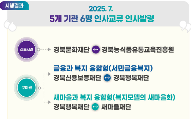 경북문화재단은 사업장별 분산되어 운영된 회계 기능을 경영기획본부로 통합했으며, 경북행복재단은 청소년육성재단과의 통합으로 인해 분산된 재무·회계 인력을 조정해 정책사업에 투입하는 등 조직기능 및 인력을 효율적으로 재구성했다.