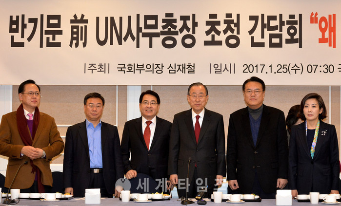 반기문 전 유엔 사무총장이 25일 오전 서울 여의도 국회에서 심재철 국회 부의장 초청으로 '왜 정치교체인가'를 주제로 한 간담회에 참석, 기념사진을 찍고 있다. 사진 왼쪽부터 이명수, 신상진, 심 부의장, 반 총장, 정진석, 나경원 의원. 2017.01.25.