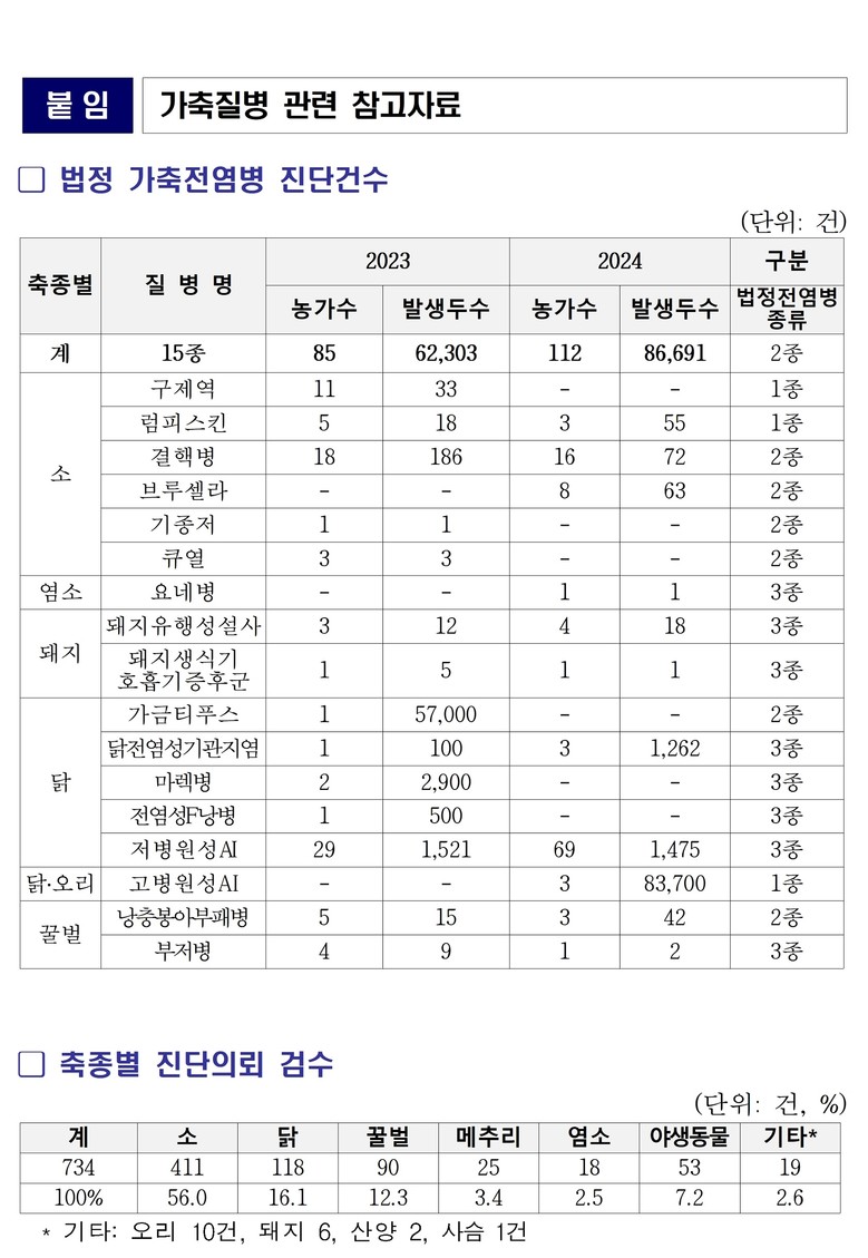 또한 닭은 폐사, 꿀벌은 중독과 폐사에 의한 의뢰가 주를 이루었다. 이와 같은 통계는 동물 질병 발생 동향을 파악하고, 효율적인 방역 대책 수립에 중요한 데이터로 활용된다.