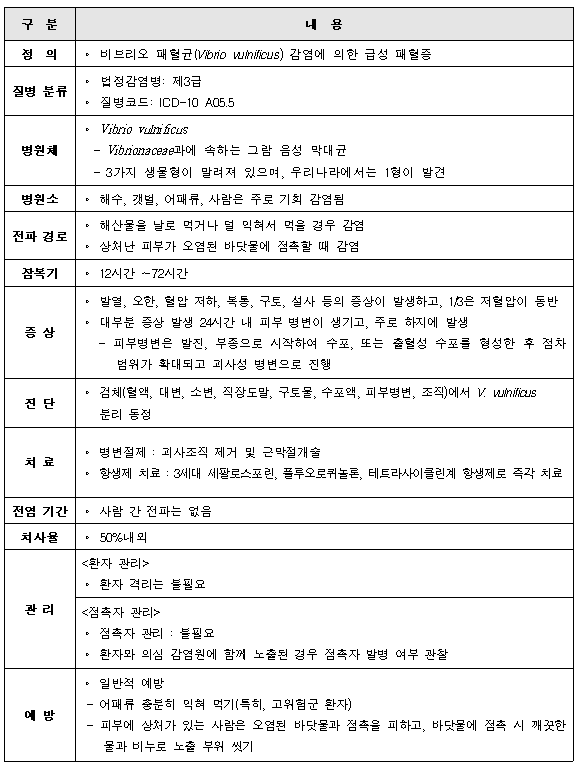 비브리오패혈증은 비브리오패혈증균(Vibrio vulnificus) 감염에 의한 급성 패혈증 질환으로, 오염된 어패류를 생식하거나 상처 난 피부가 오염된 바닷물에 접촉돼 감염되는 감염증이다.