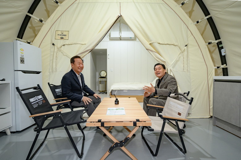 | ▲ 10월 22일 열린 청량산 수원캠핑장 개장식 후 이재준 수원시장(오른쪽)과 박현국 봉화군수가 글램핑 시설을 살펴보고 있다. |