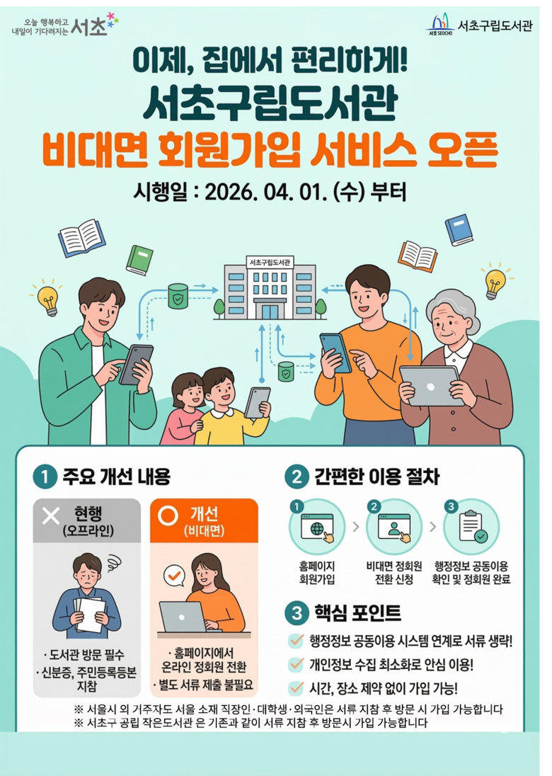 비대면 회원가입은 서울시에 거주하는 시민이라면 누구나 이용할 수 있다. 다만, 서울 소재 직장 재직자나 학교 재학생 등의 경우 개인정보 관련 증빙서류 확인을 위해 기존과 동일하게 도서관 방문을 통한 정회원 전환만 가능하다. 구는 노약자·영유아 등 스마트기기 이용이 어려운 이용자를 위해 도서관 방문 시 직원 안내를 받아 회원증을 발급받을 수 있는 현장 발급 서비스도 계속 유지할 계획이다. 자세한 사항은 서초구립도서관 홈페이지를 확인하거나 서초구청 도서관팀(☎ 02-2155-8638)으로 문의하면 된다.