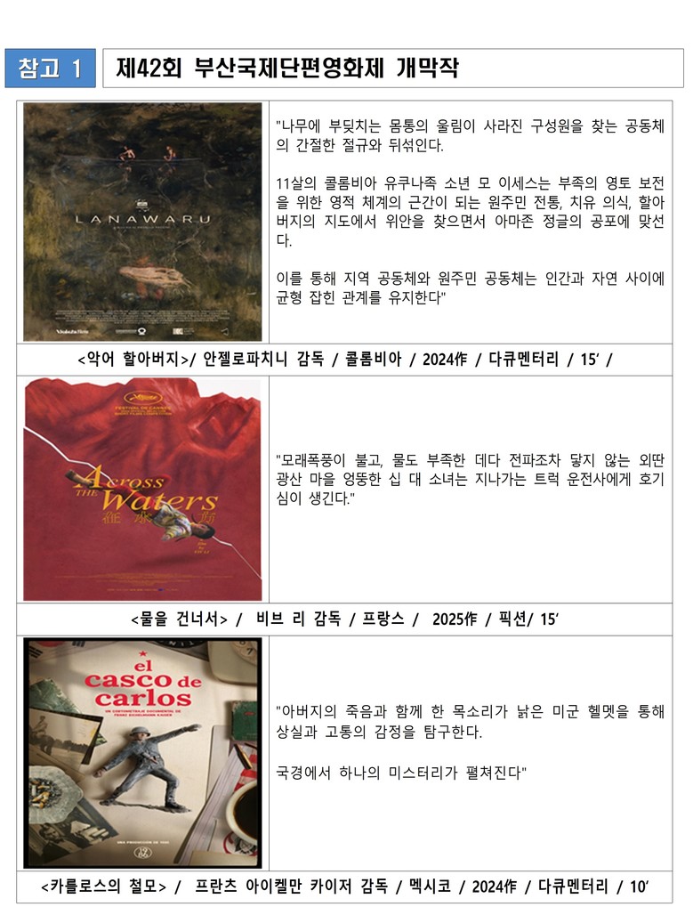 선정된 3편의 작품 ▲주빈국 콜롬비아 작품 <악어 할아버지> ▲프랑스 작품 <물을 넘어서> ▲멕시코 작품 <카를로스의 철모>는 4월 24일 오후 7시 영화의전당 하늘연극장에서 열리는 개막식에서 공개될 예정이다.
