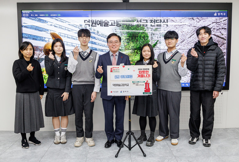 구는 19일(금) 덕원예술고로부터 이웃돕기 성금 69만 9500원을 전달받았다. 성금은 전교생 594명이 용돈을 모아 마련한 것으로, 이날 학생 대표 4명이 구청을 찾아 후원 의사를 밝혔다.
