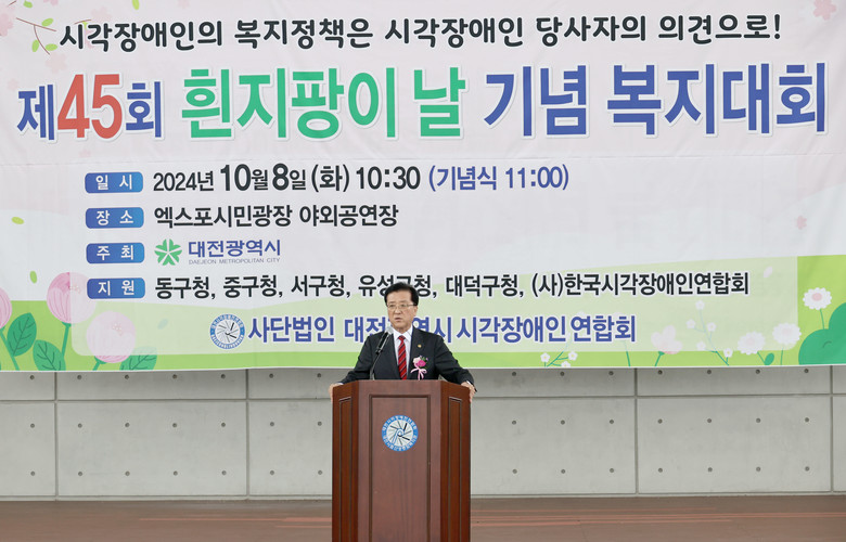 [대전 세계타임즈=이채봉 기자] 대전시의회 조원휘 의장은 8일 엑스포 시민광장에서 개최된 ‘제45회 흰지팡이의 날 기념 복지대회’에 참석해 “장애, 비장애를 넘어 모두가 함께 어우러져 살 수 있도록 제도 개선과 정책 지원에 최선을 다하겠다”고 말했다.
