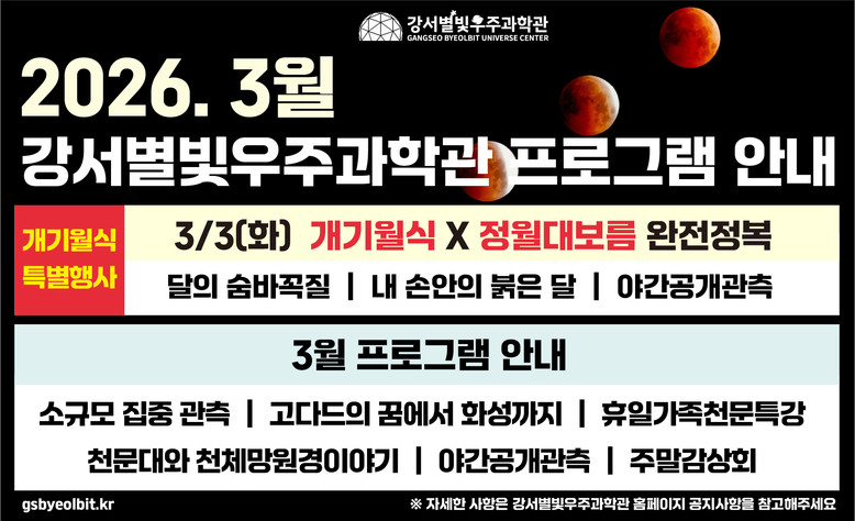 구 관계자는 “새 학기와 봄을 맞아 활기차고 다채롭게 즐길 수 있도록 천체 프로그램을 준비했다”며, “앞으로도 천체현상에 맞춘 다양한 특별 프로그램을 지속해서 기획하겠다”고 말했다.