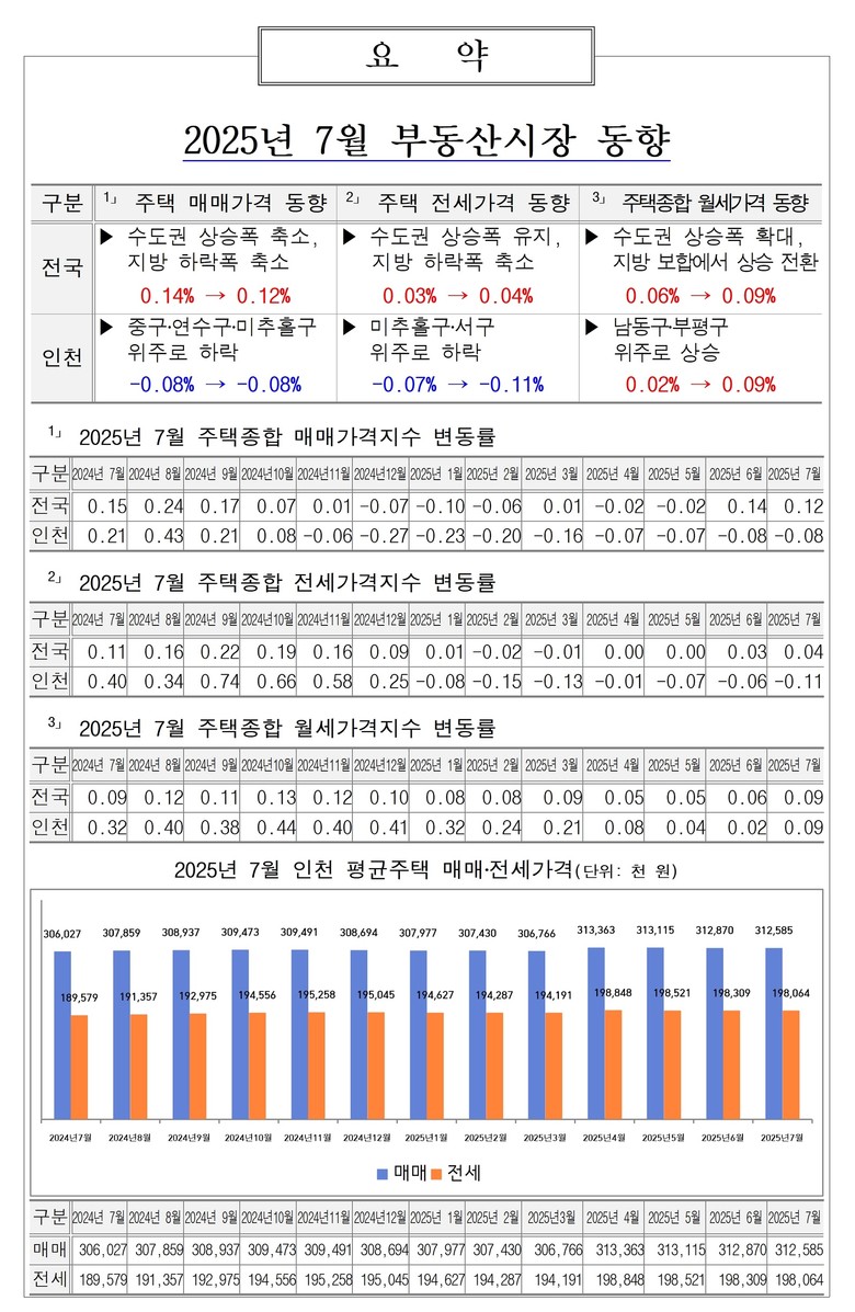 인천시가 한국부동산원의 부동산 통계정보를 분석해 발표한 ‘2025년 7월 부동산시장 동향 보고서’에 따르면, 7월 인천의 주택 매매가격지수 변동률은 전월과 동일하게 –0.08%로 나타나 하락폭이 유지됐다. 지역별로는 중구(-0.24%→-0.15%), 연수구(-0.32%→-0.12%), 미추홀구(-0.12%→-0.11%), 서구(-0.02%→-0.10%), 계양구(-0.07%→-0.10%), 동구(-0.02%→-0.04%) 등은 하락세가 지속됐다. 반면, 남동구(0.00%→-0.02%)와 부평구(0.03%→-0.06%)는 상승세에서 하락세로 전환됐다.
