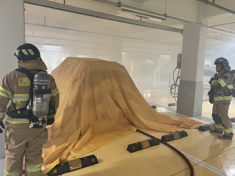 훈련내용은 ▲불이 난 차량을 덮어 산소를 차단하는 질식소화포 훈련▲전기차량 화재 주원인인 배터리를 중점으로 화재 진압하는 하부 주수식 관창 훈련 ▲차량 주변을 물로 냉각하는 방식의 휴대용(포켓식) 소화수조 등이다.