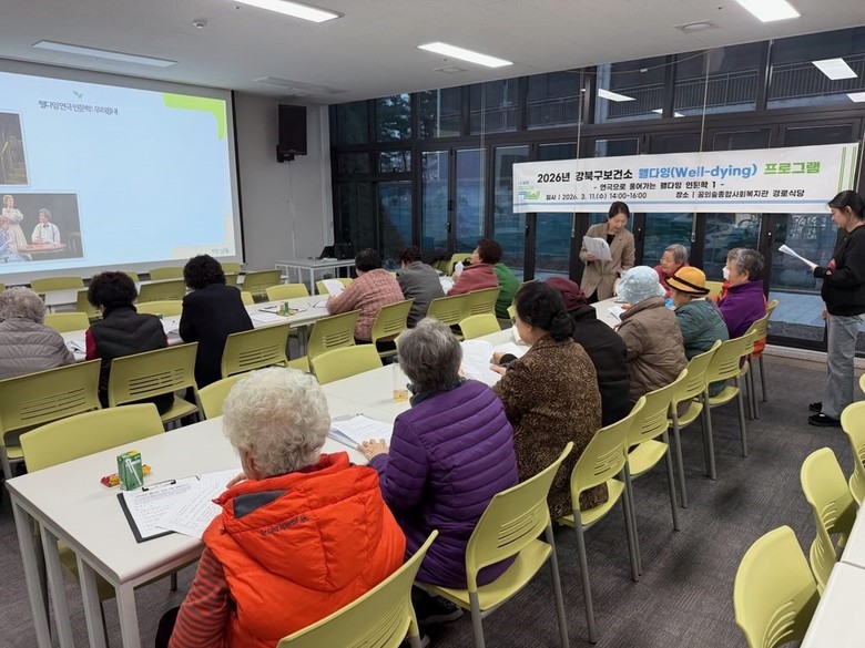 이순희 강북구청장은 “웰다잉 프로그램을 통해 존엄한 삶의 가치를 찾기를 기대한다”며 “앞으로도 구민들이 의미 있는 노후를 준비할 수 있도록 교육과 홍보를 지속적으로 추진하겠다”고 말했다.