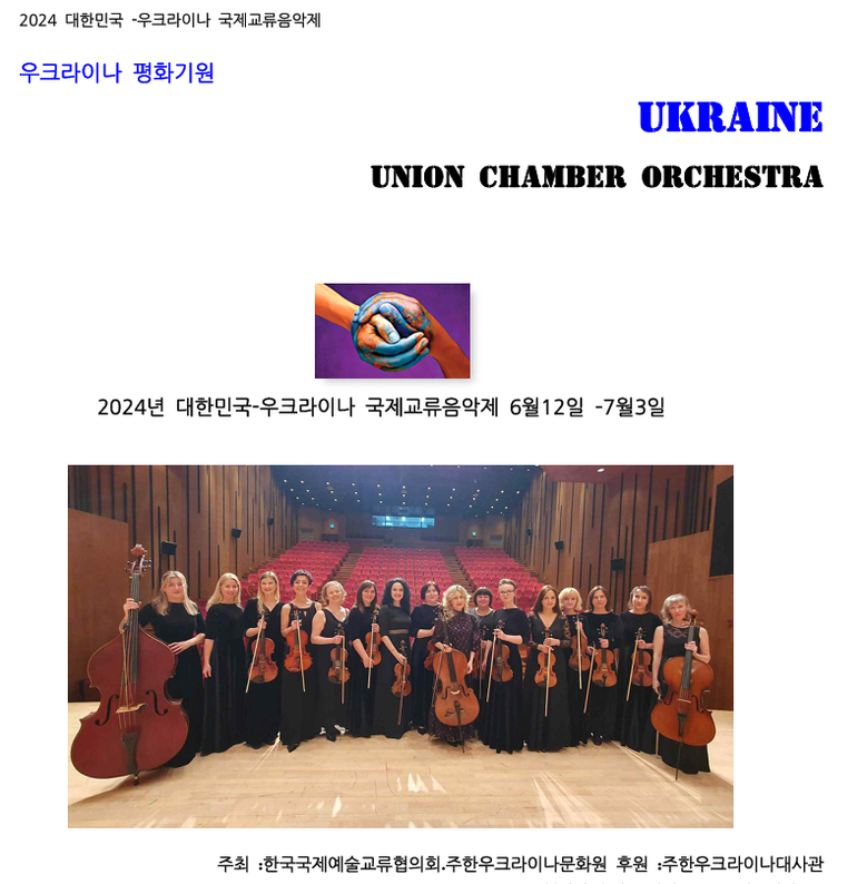 이번 행사는 6월13일 장유도서관 문화화홀 / 14일 안동소천음악관 / 16일 이화여대 김영의홀 / 18일 봉화중고교/ 19일 평택남부문화회관/ 21일 해운대문화회관 /7월1일 서울 영산아트홀에서 우크라이나 "유니온 쳄버 오케스트라" 연주로 화려하게 막을 올린다.