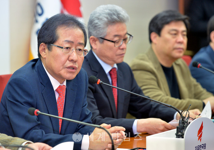 2일 오전 서울 여의도 자유한국당 당사에서 열린 선거대책회의에 참석한 홍준표(왼쪽) 대선 후보가 모두발언하고 있다. 홍 후보는 박근혜 전 대통령을 끌어내리는데 앞장서고 구속까지 밀어부쳤던 좌파와 얼치기좌파 세력들이 우파들의 동정표를 노리고 박 대통령의 사면을 운운하고 있다며 더불어민주당 문재인, 국민의당 안철수 경선 후보를 비판했다. 2017.04.02.
