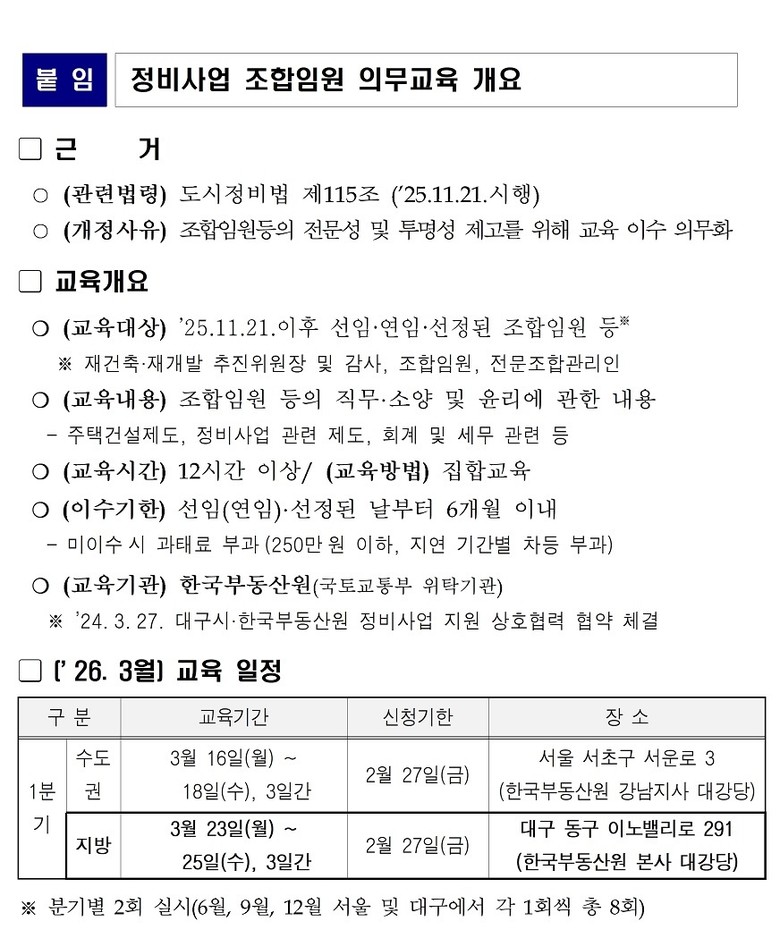 이에 따라 2025년 11월 21일 이후 선임·연임되거나 선정된 추진위원장, 감사, 조합임원, 전문조합관리인 등은 선임된 날로부터 6개월 이내에 반드시 교육을 이수해야 한다. 이를 위반할 경우 과태료 부과 등 불이익을 받을 수 있다.