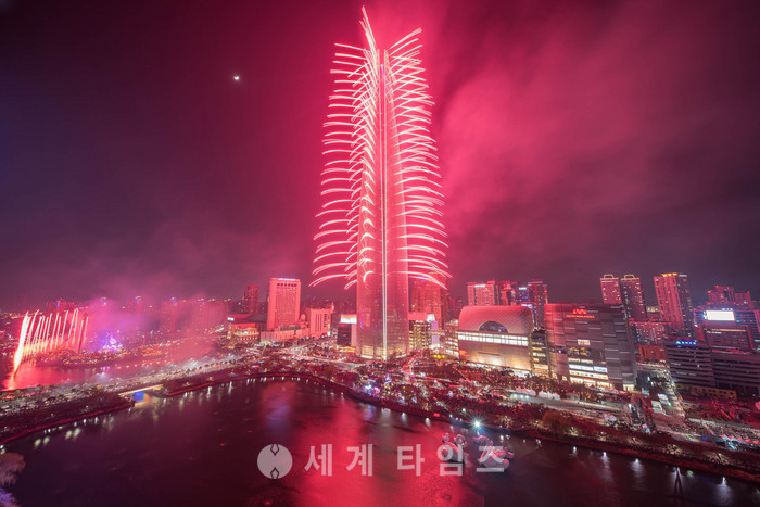 세계에서 5번째로 높은 건물인 롯데월드타워(지하 6층,지상 123층 555m) 개장을 하루 앞둔 2일 오후 서울 송파구 롯데월드타워에서 화려한 불꽃쇼가 펼쳐지고 있다. 이번 롯데월드타워 불꽃축제에는 11분간 3만여 발의 불꽃이 밤하늘을 수놓았으며 40억 여원이 소요됐다. 2017.04.02.(사진=롯데물산 제공)