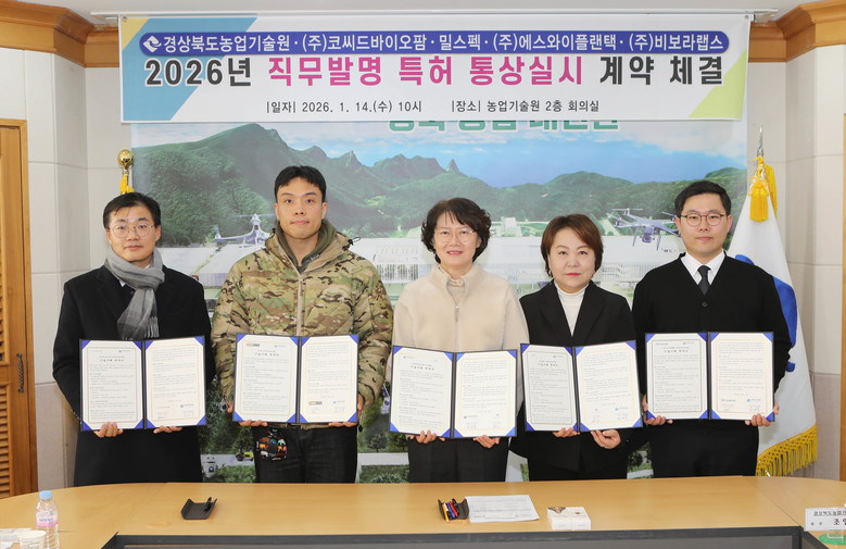 - 연구 성과 기업체 기술이전을 통한 사업화 추진 - [경북 세계타임즈=한윤석 기자] 경상북도농업기술원은 자체 개발한 직무발명 특허의 산업화를 위해 14일 기술이전 대상 업체 관계자들이 참석한 가운데 총 5건의 직무발명 특허 통상 실시 계약을 체결했다.